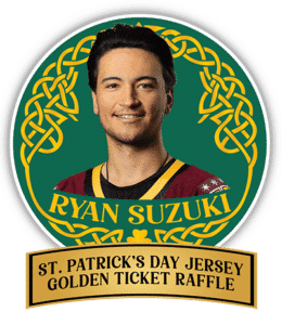 One of forward Ryan Suzuki’s St. Patrick’s Day jerseys is available via the Golden Ticket Raffle. There are 50 raffle tickets available for $50 per ticket, meaning each ticket has a 1-in-50 chance of being selected. The Golden Ticket Raffle can be entered online here.